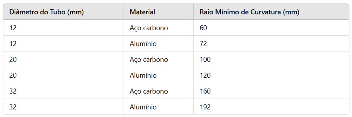 Para tornar o processo de curvatura mais prático, aqui está uma tabela de referência com os raios de curvatura recomendados para diferentes diâmetros de tubos e materiais: